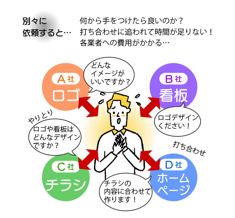 開店・開業するにあたり、チラシ広告・ホームページ・店舗内設備や販促物のデザイン・制作をどのように進めればよいかわからない。またはこだわりや安さを追求して、色々な業者に依頼しようとしていますか?