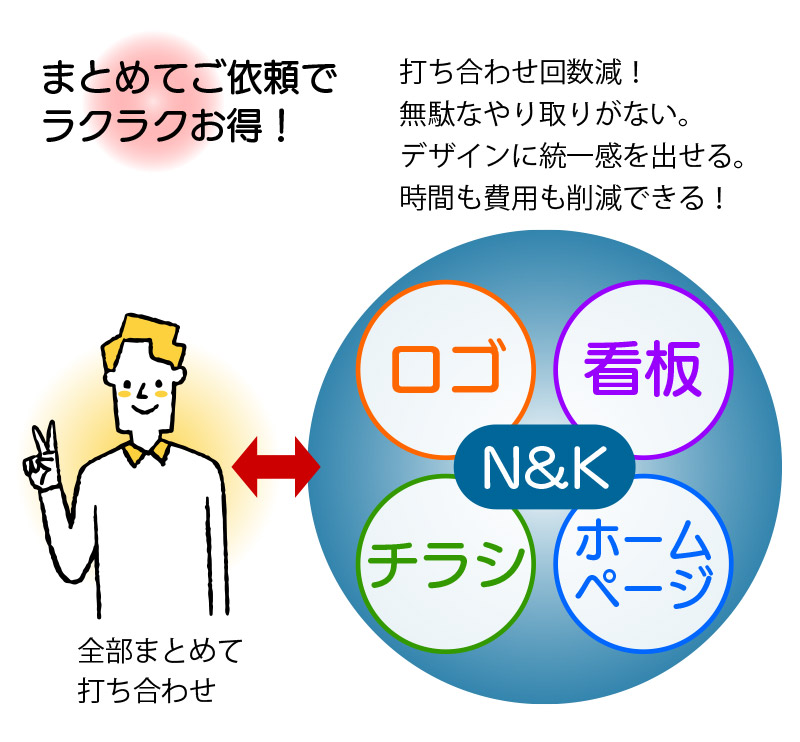 当社にまとめてご依頼いただくことで、お打ち合わせの時間短縮、デザインの統一感も出しやすくなり、無駄な費用も削減することができます。